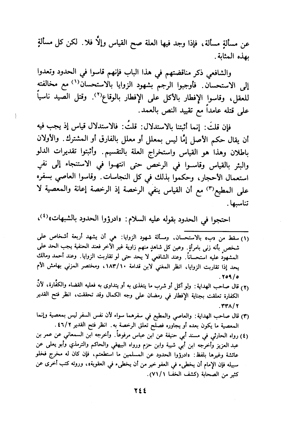 فإن قلتَ: إنما أثبتنا بالاستدلال: قلت: فالاستدلال قياس إذ يجب فيه أن يقال حكم الأصل إمَّا ليس بمعلل أو معلل بالفارق أو المشترك. والأولان باطلان وهذا هو القياس واستخراج العلة بالتقسيم. وأثبتوا تقديرات الدلو والبئر بالقياس وقاسوا في الرخص حتى انتهوا في الاستنجاء إلى نفي استعمال الأحجار، وحكموا بذلك في كل النجاسات. وقاسوا العاصي بسفره على المطيع (٣) مع أن القياس ينفي الرخصة إذ الرخصة إعانة والمعصية لا تناسبها.