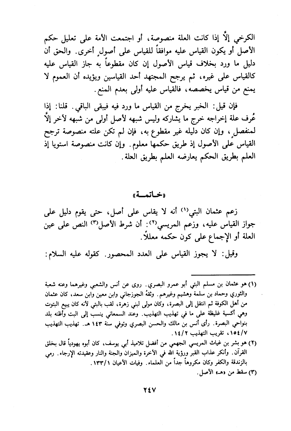 الكرخي الَّا إذا كانت العلة منصوصة، أو اجتمعت الأمة على تعليل حكم الأصل أو يكون القياس عليه موافقاً للقياس على أصولٍ أخرى. والحق أن دليل ما ورد بخلاف قياس الأصول إن كان مقطوعاً به جاز القياس عليه كالقياس على غيره، ثم يرجح المجتهد أحد القياسين ويؤيده أن العموم لا يمنع من قياس يخصصه، فالقياس عليه أولى بعدم المنع.