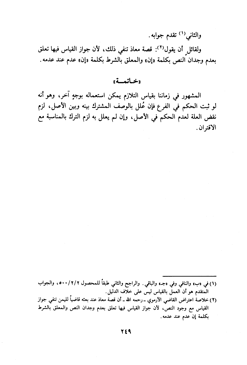 (٢) خلاصة اعتراض القاضي الأرموي - رحمه الله - أن قصة معاذ عند بعثه قاضياً لليمن تنفي جواز القياس مع وجود النص، لأن جواز القياس فيها تعلق بعدم وجدان النص والمعلق بالشرط بكلمة إن عدم عند عدمه.
