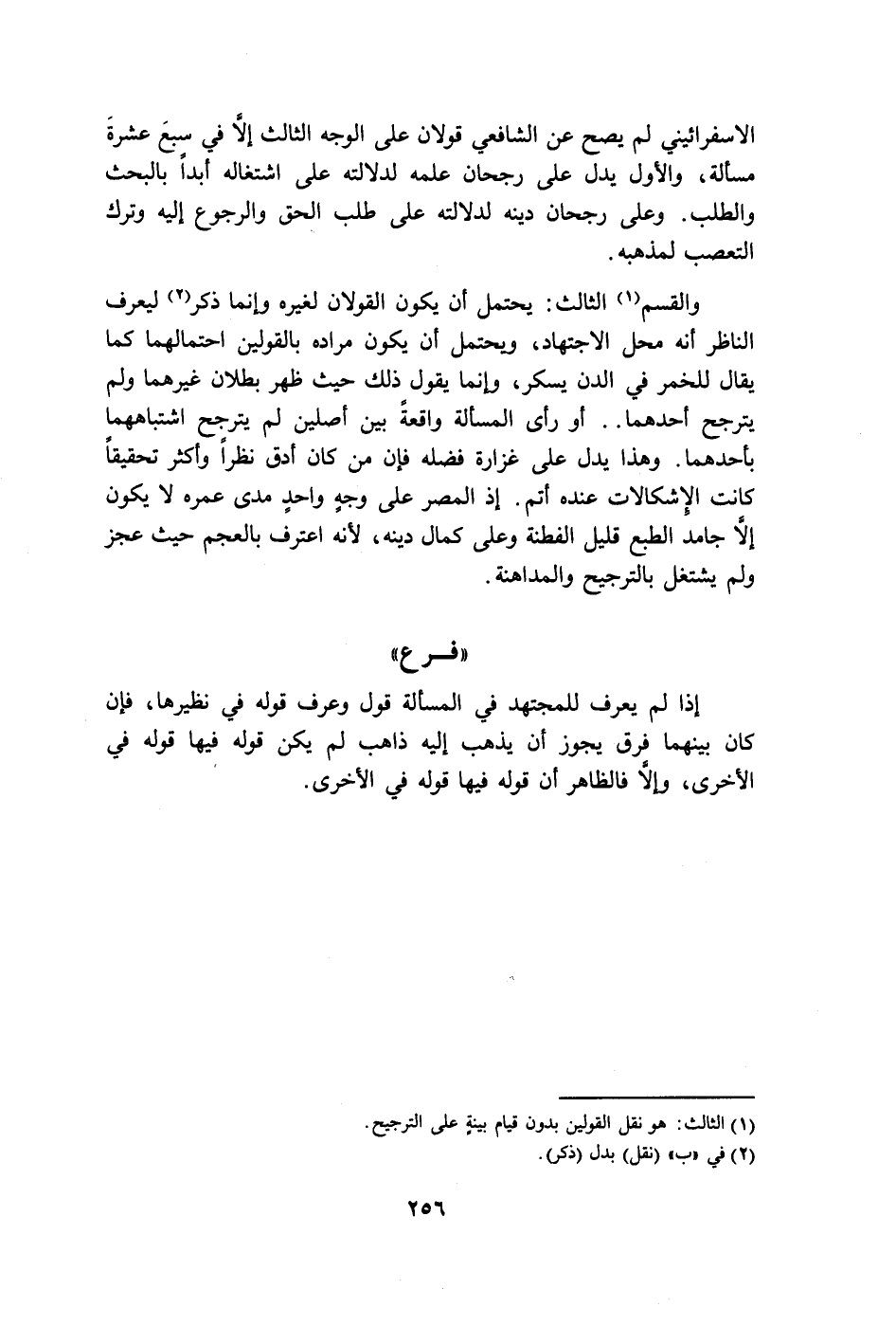 والقسم (١) الثالث: يحتمل أن يكون القولان لغيره وإنما ذكر (٢) ليعرف الناظر أنه محل الاجتهاد، ويحتمل أن يكون مراده بالقولين احتمالهما كما يقال للخمر في الدن يسكر، وإنما يقول ذلك حيث ظهر بطلان غيرهما ولم يترجح أحدهما .. أو رأى المسألة واقعةً بين أصلين لم يترجح اشتباههما بأحدهما. وهذا يدل على غزارة فضله فإن من كان أدق نظراً وأكثر تحقيقاً كانت الإشكالات عنده أتم. إذ المصر على وجهٍ واحدٍ مدى عمره لا يكون إلا جامد الطبع قليل الفطنة وعلى كمال دينه، لأنه اعترف بالعجم حيث عجز ولم يشتغل بالترجيح والمداهنة.