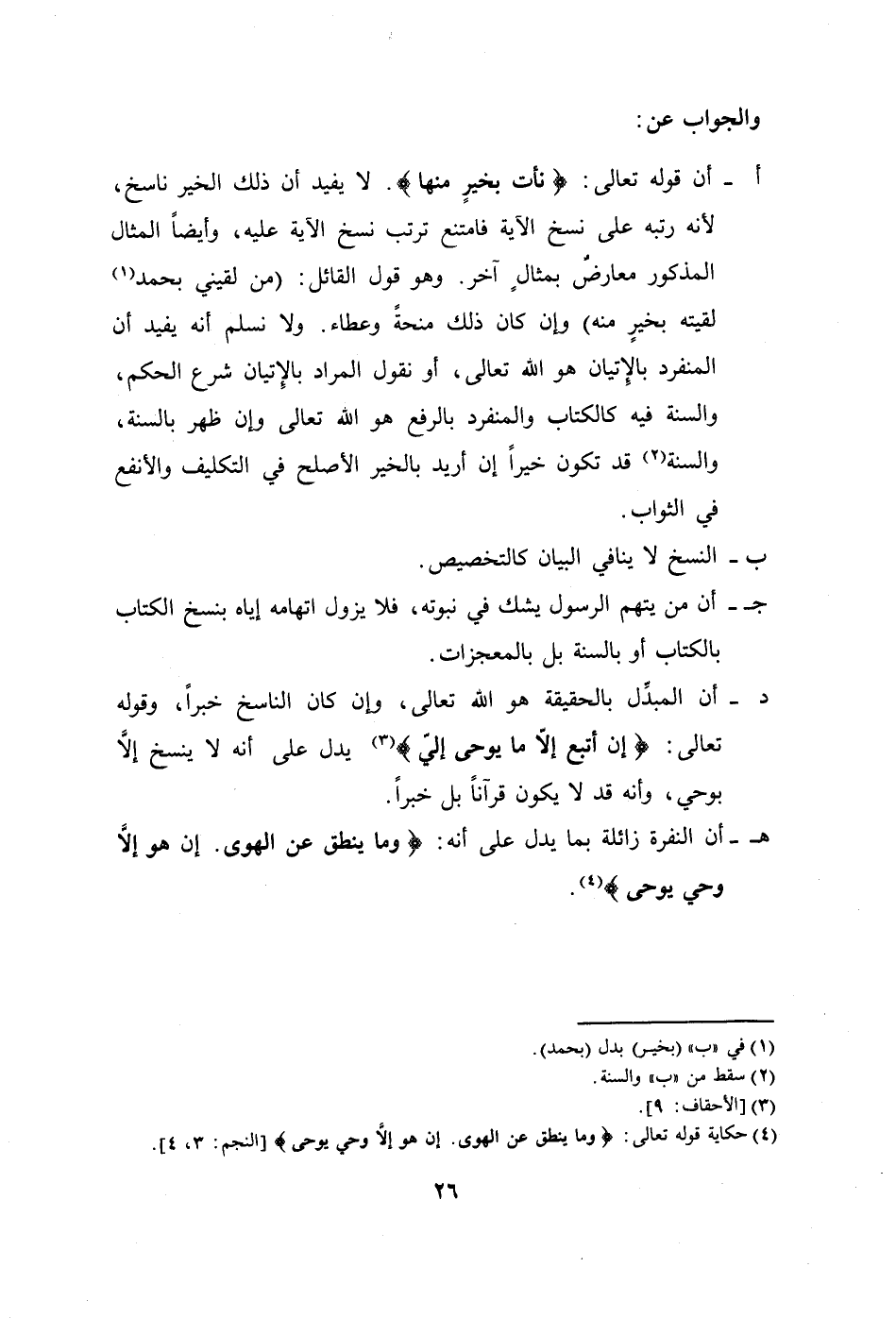 أ- أن قوله تعالى: {نَأْتِ بِخَيْرٍ مِنْهَا}. لا يفيد أن ذلك الخير ناسخ، لأنه رتبه على نسخ الآية فامتنع ترتب نسخ الآية عليه، وأيضاً المثال المذكور معارضٌ بمثالٍ آخر. وهو قول القائل: (من لقيني بحمد (١) لقيته بخيرٍ منه) وإن كان ذلك منحةً وعطاء. ولا نسلم أنه يفيد أن المنفرد بالِإتيان هو الله تعالى، أو نقول المراد بالِإتيان شرع الحكم، والسنة فيه كالكتاب والمنفرد بالرفع هو الله تعالى وإن ظهر بالسنة، والسنة (٢) قد تكون خيراً إن أريد بالخير الأصلح في التكليف والأنفع في الثواب.