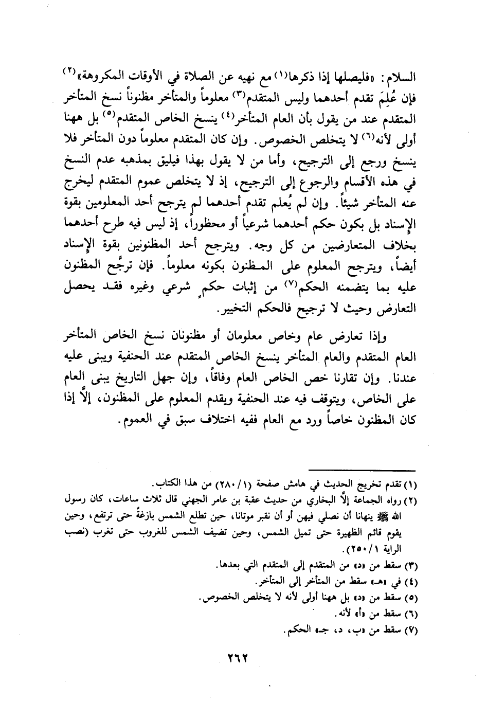 السلام: "فليصلها إذا ذكرها (١) مع نهيه عن الصلاة في الأوقات المكروهة" (٢) فإن عُلِمَ تقدم أحدهما وليس المتقدم (٣) معلومًا والمتأخر مظنونًا نسخ المتأخر المتقدم عند من يقول بأن العام المتأخر (٤) ينسخ الخاص المتقدم (٥) بل ههنا أولى لأنه (٦) لا يتخلص الخصوص. وإن كان المتقدم معلومًا دون المتأخر فلا ينسخ ورجع إلى الترجيح، وأما من لا يقول بهذا فيليق بمذهبه عدم النسخ في هذه الأقسام والرجوع إلى الترجيح، إذ لا يتخلص عموم المتقدم ليخرج عنه المتأخر شيئًا. وإن لم يُعلم تقدم أحدهما لم يترجح أحد المعلومين بقوة الإسناد بل بكون حكم أحدهما شرعيًّا أو محظورًا، إذ ليس فيه طرح أحدهما
