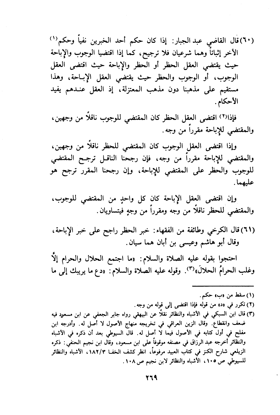 (٦٠) قال القاضي عبد الجبار: إذا كان حكم أحد الخبرين نفيًا وحكم (١) الأخر إثباتًا وهما شرعيان فلا ترجيح، كما إذا اقتضيا الوجوب والإباحة حيث يقتضي العقل الحظر أو الحظر والإباحة حيث اقتضى العقل الوجوب، أو الوجوب والحظر حيث يقتضي العقل الإباحة، وهذا مستقيم على مذهبنا دون مذهب المعتزلة، إذ العقل عندهم يفيد الأحكام.