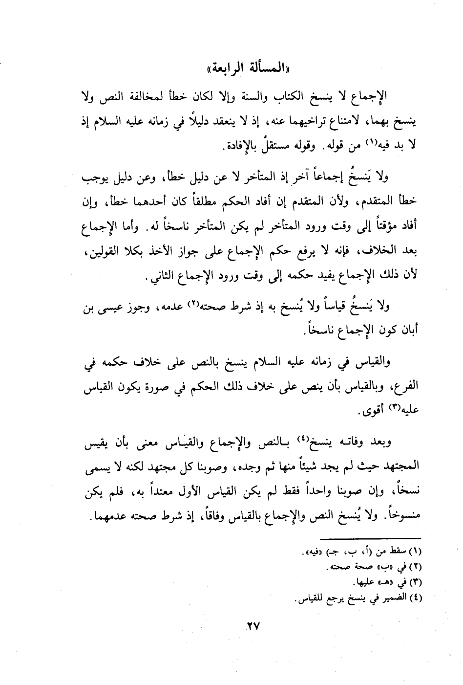 وبعد وفاته ينسخ (٤) بالنص والِإجماع والقياس معنى بأن يقيس المجتهد حيث لم يجد شيئاً منها ثم وجده، وصوبنا كل مجتهد لكنه لا يسمى نسخاً، وإن صوبنا واحداً فقط لم يكن القياس الأول معتداً به، فلم يكن منسوخاً. ولا يُنسخ النص والِإجماع بالقياس وفاقاً، إذ شرط صحته عدمهما.