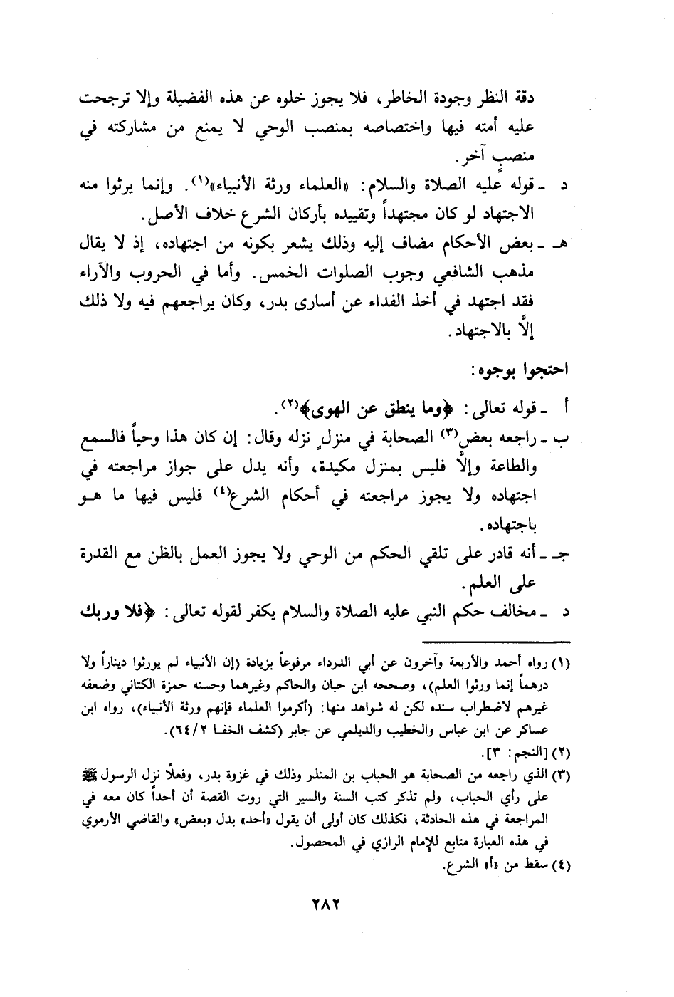 (٣) الَّذي راجعه من الصحابة هو الحباب بن المنذر وذلك في غزوة بدر، وفعلًا نزل الرسول - صلى الله عليه وسلم - على رأي الحباب، ولم تذكر كتب السنة والسير التي روت القصة أن أحدًا كان معه في المراجعة في هذه الحادثة، فكذلك كان أولى أن يقول "أحد" بدل "بعض" والقاضي الأرموي في هذه العبارة متابع للإمام الرازي في المحصول.