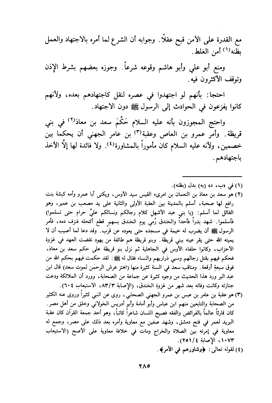 واحتج المجوزون بأنه عليه السلام حَكَّمَ سعد بن معاذ (٢) في بني قريظة. وأمر عمرو بن العاص وعقبة (٣) بن عامر الجهني أن يحكما بين خصمين، ولأنه عليه السلام كان مأمورًا بالمشاورة (٤). ولا فائدة لها إلَّا الأخذ باجتهادهم.