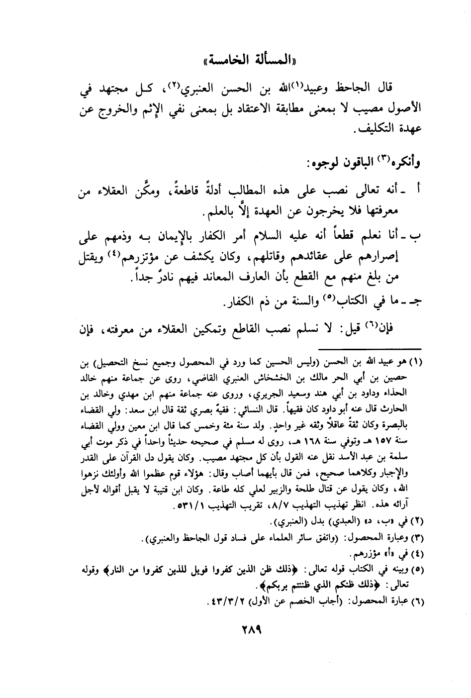 قال الجاحظ وعبيد (١) الله بن الحسن العنبري (٢)، كل مجتهد في الأصول مصيب لا بمعنى مطابقة الاعتقاد بل بمعنى نفي الإِثم والخروج عن عهدة التكليف.