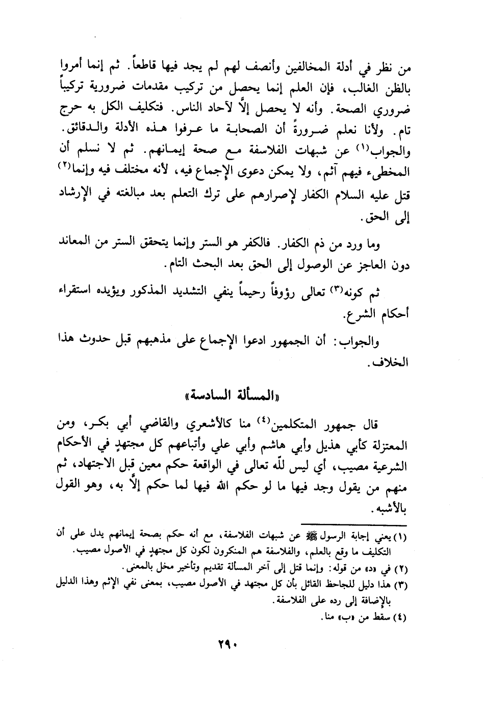 والجواب (١) عن شبهات الفلاسفة مع صحة إيمانهم. ثم لا نسلم أن المخطئ فيهم آثم، ولا يمكن دعوى الإجماع فيه، لأنه مختلف فيه وإنما (٢) قتل عليه السلام الكفار لإصرارهم على ترك التعلم بعد مبالغته في الإرشاد إلى الحق.