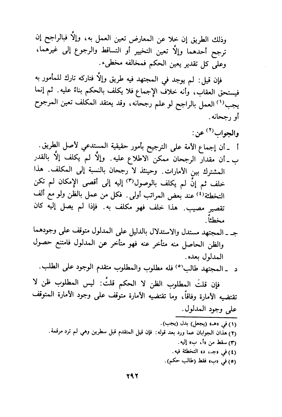 ب - أن مقدار الرجحان ممكن الاطلاع عليه. وإلَّا لم يكلف إلَّا بالقدر المشترك بين الأمارات. وحينئذ لا رجحان بالنسبة إِلى المكلف. هذا خلف ثم إنَّ لم يكلف بالوصول (٣) إِليه إلى أقصى الإِمكان لم تكن التخطئة (٤) عند بعض المراتب أولى. فكل من عمل بالظن ولو مع ألف تقصير مصيب. هذا خلف فهو مكلف به. فإذا لم يصل إليه كان مخطئًا.