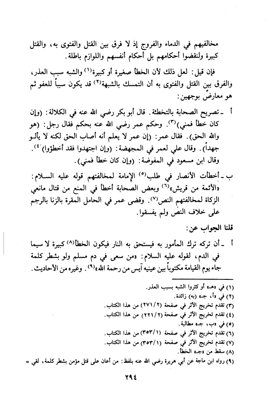 ب - أخطات الأنصار في طلب (٥) الإمامة لمخالفتهم قوله عليه السلام: "الأئمة من قريش" (٦) وبعض الصحابة أخطأ في المنع من قتال مانعي الزكاة لمخالفتهم النص (٧). وقضى عمر في الحامل المقرة بالزنا بالرجم على خلاف النص ولم يفسقوا.