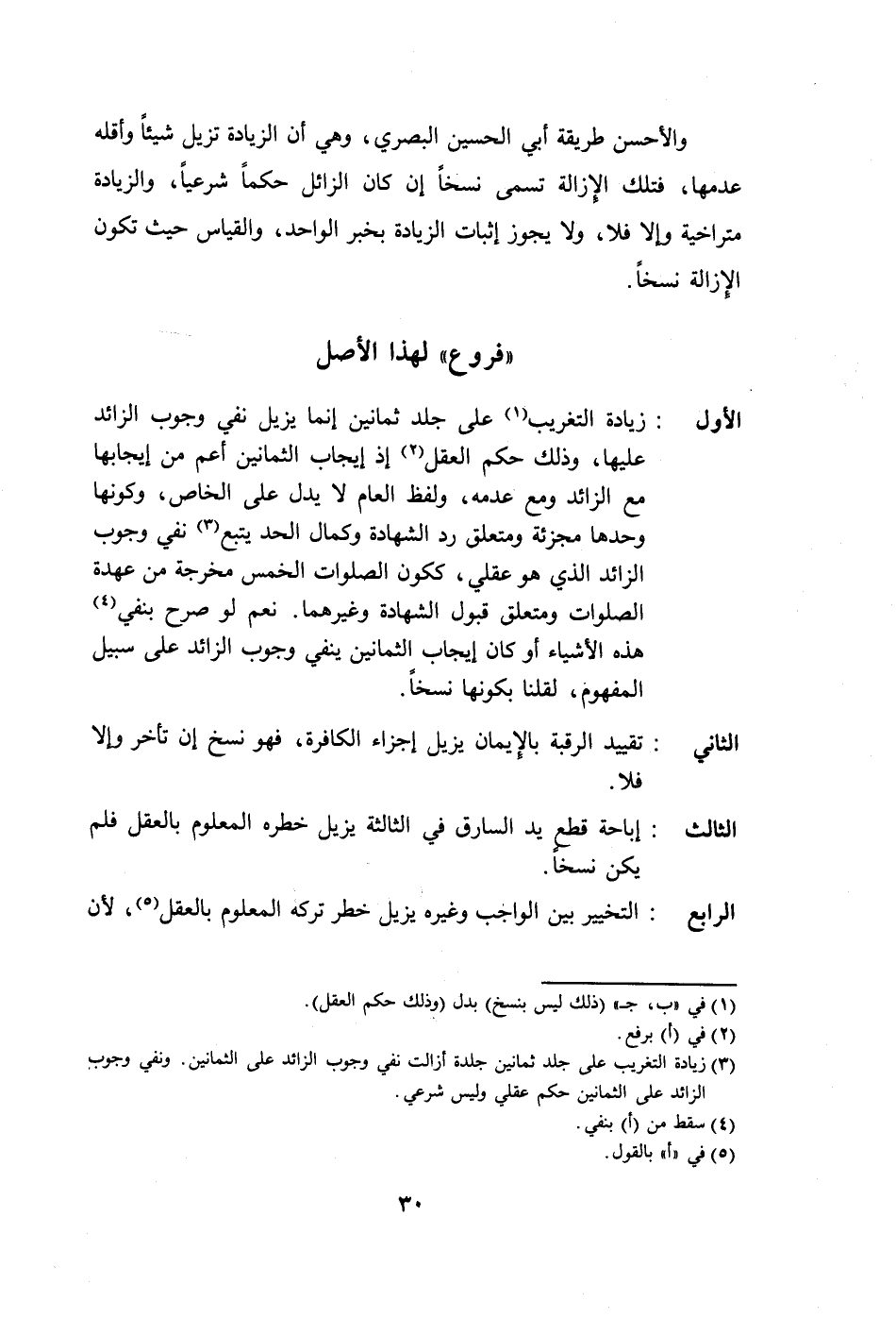 الأول: زيادة التغريب (١) على جلد ثمانين إنما يزيل نفي وجوب الزائد عليها، وذلك حكم العقل (٢) إذ إيجاب الثمانين أعم من إيجابها مع الزائد ومع عدمه، ولفظ العام لا يدل على الخاص، وكونها وحدها مجزئة ومتعلق رد الشهادة وكمال الحد يتبع (٣) نفي وجوب الزائد الذي هو عقلي، ككون الصلوات الخمس مخرجة من عهدة الصلوات ومتعلق قبول الشهادة وغيرهما. نعم لو صرح بنفي (٤) هذه الأشياء أو كان إيجاب الثمانين ينفي وجوب الزائد على سبيل المفهوم، لقلنا بكونها نسخاً.