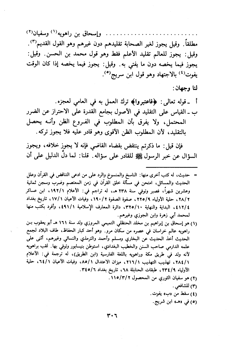 ............... وإسحاق بن راهويه (١) وسفيان (٢) مطلقًا. وقيل يجوز لغير الصحابة تقليدهم دون غيرهم وهو القول القديم (٣).