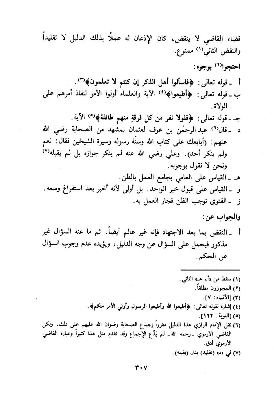 (٦) نقل الإمام الرازي هذا الدليل مقرراً إجماع الصحابة رضوان الله عليهم على ذلك، ولكن القاضي الأرموي- رحمه الله- لم يَدَّع الإجماع وقد تقدم مثل هذا كثيراً وعبارة القاضي الأرموي أدق.