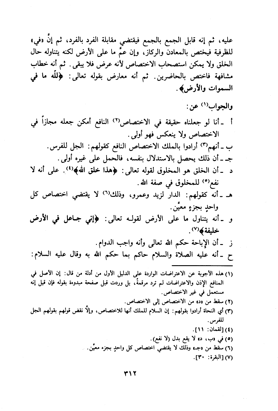 د- أن الخلق هو المخلوق لقوله تعالى: {هَذَا خَلْقُ اللَّهِ} (٤). على أنه لا نفع (٥) للمخلوق في صفة الله.