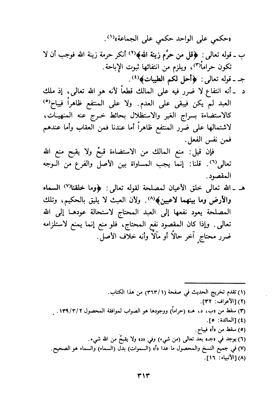 هـ- الله تعالى خلق الأعيان لمصلحة لقوله تعالى: {وَمَا خَلَقْنَا (٧) السَّمَاءَ وَالْأَرْضَ وَمَا بَيْنَهُمَا لَاعِبِينَ} (٨). ولأن العبث لا يليق بالحكيم، وتلك المصلحة يعود نفعها إلى العبد المحتاج لاستحالة عودها إلى الله تعالى. وإذا كان المقصود نفع المحتاج، فلو منع إنما يمنع لاستلزامه ضرر محتاج آخر حالاً أو مالا وأنه خلاف الأصل.