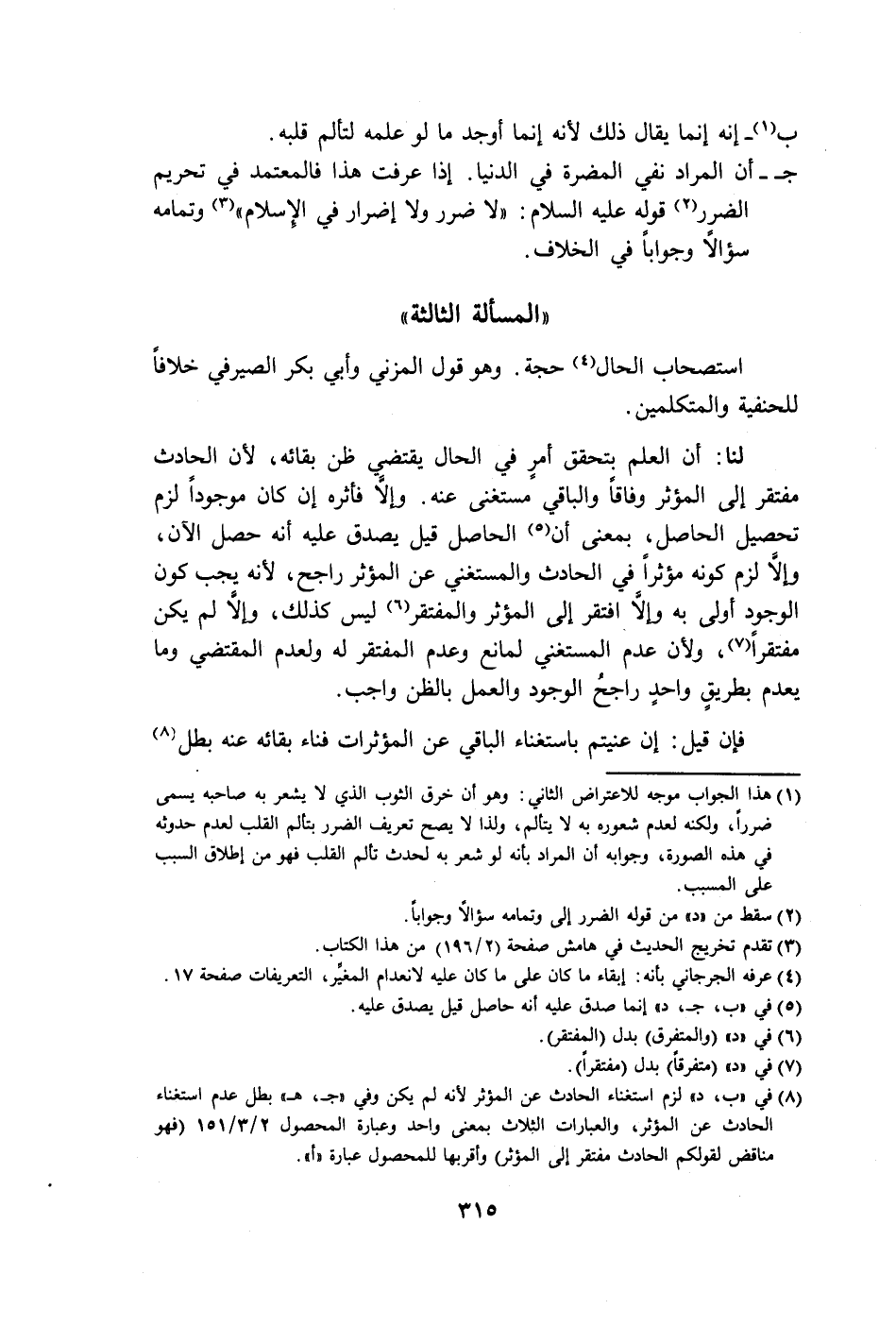 (٨) في "ب، د" لزم استغناء الحادث عن المؤثر لأنه لم يكن وفي "جـ، هـ" بطل عدم استغناء الحادث عن المؤثر، والعبارات الثلاث بمعنى واحد وعبارة المحصول ٢/ ٣/ ١٥١ (فهو مناقض لقولكم الحادث مفتقر إلى المؤثر) وأقربها للمحصول عبارة "أ".