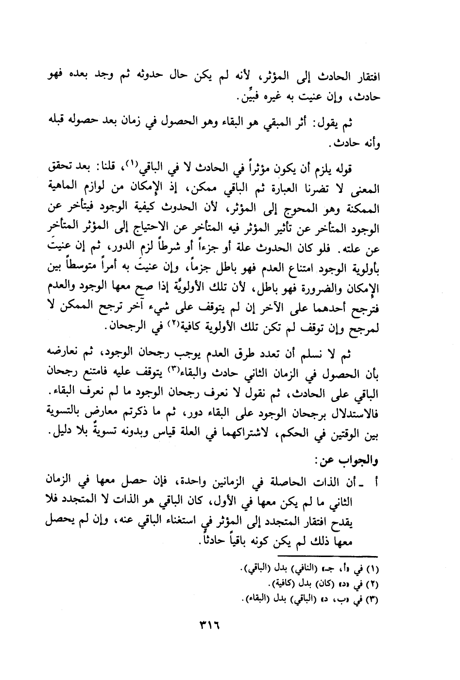 أ- أن الذات الحاصلة في الزمانين واحدة، فإن حصل معها في الزمان الثاني ما لم يكن معها في الأول، كان الباقي هو الذات لا المتجدد فلا يقدح افتقار المتجدد إلى المؤثر في استغناء الباقي عنه، وإن لم يحصل معها ذلك لم يكن كونه باقياً حادثاً.