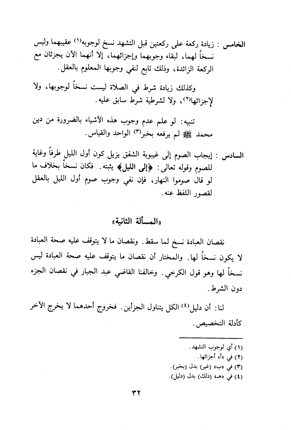 الخامس: زيادة ركعة على ركعتين قبل التشهد نسخ لوجوبه (١) عقيبهما وليس نسخاً لهما، لبقاء وجوبهما وإجزائهما، إلا أنهما الآن يجزئان مع الركعة الزائدة، وذلك تابع لنفي وجوبها المعلوم بالعقل.