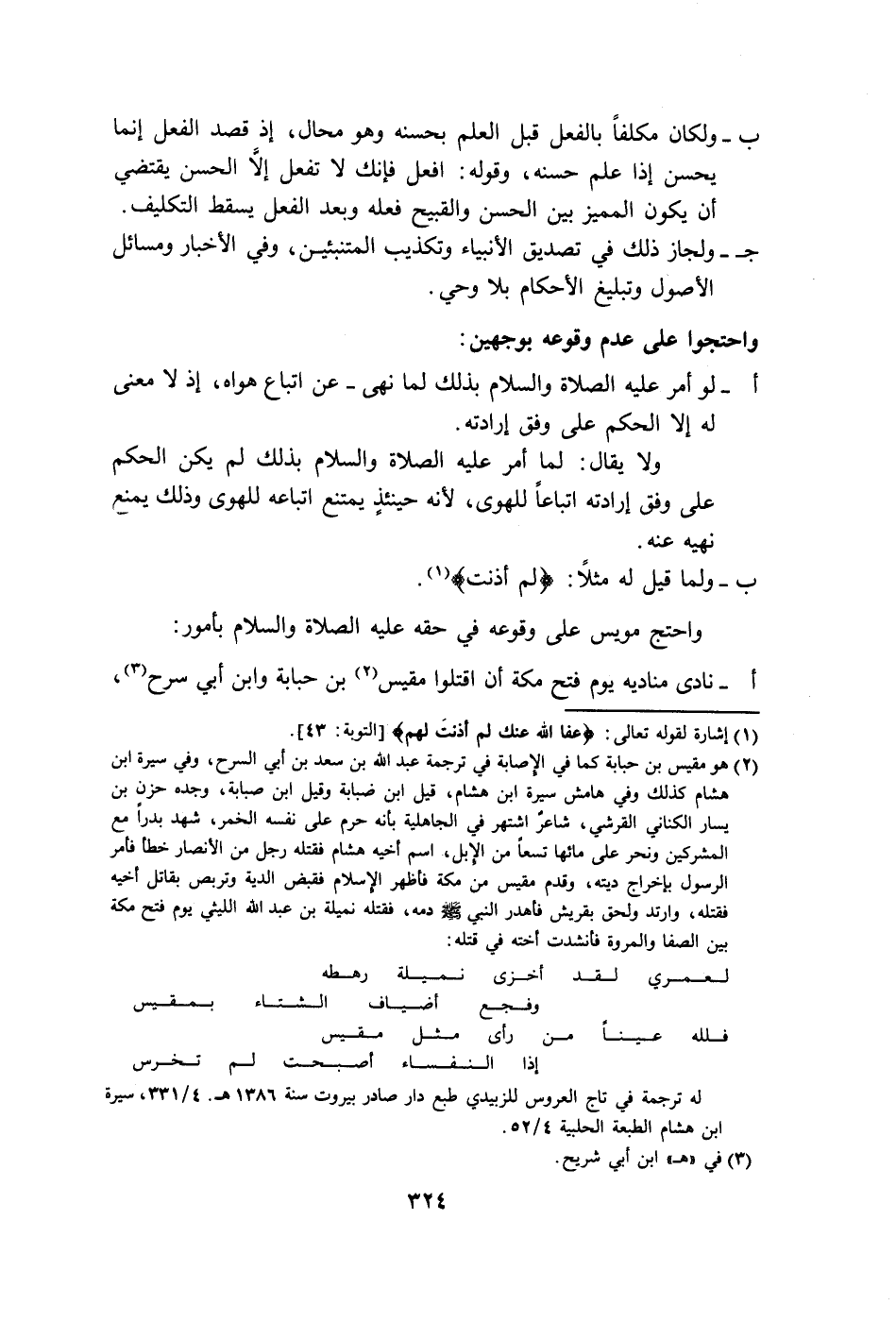 ب- ولكان مكلفاً بالفعل قبل العلم بحسنه وهو محال، إذ قصد الفعل إنما يحسن إذا علم حسنه، وقوله: افعل فإنك لا تفعل إلَاَ الحسن يقتضي أن يكون المميز بين الحسن والقبيح فعله وبعد الفعل يسقط التكليف.
