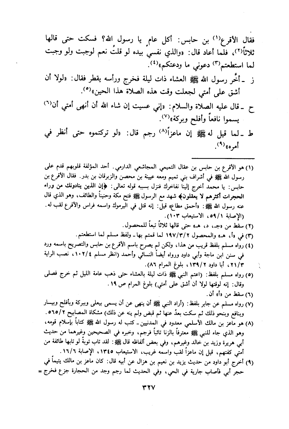 (٥) رواه مسلم بلفظ: (اعتم النبي - صلى الله عليه وسلم - ذات ليلة بالعشاء حتى ذهب عامة الليل ثم خرج فصلى وقال: إنه لوقتها لولا أن أشق على أمتي) بلوغ المرام ص ١٩.