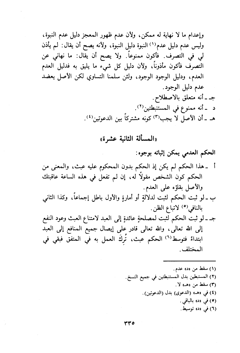 وإعدام ما لا نهاية له ممكن، ولأن عدم ظهور المعجز دليل عدم النبوة، وليس عدم دليل عدم (١) النبوة دليلِ النبوة، ولأنه يصح أن يقال: لم يأذن لي في التصرف. فأكون ممنوعاً. ولا يصح أن يقال: ما نهاني عن التصرف فأكون مأذوناً، ولأن دليل كل شيء ما يليق به فدليل العدم العدم، ودليل الوجود الوجود، ولئن سلمنا التساوي لكن الأصل يعضد عدم دليل الوجود.