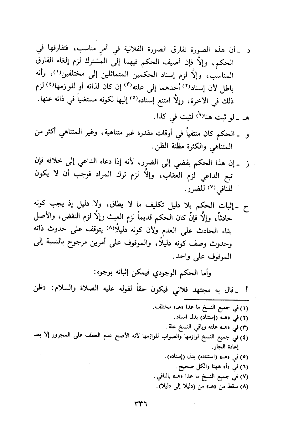 ح - إثبات الحكم بلا دليل تكليف ما لا يطاق، ولا دليل إذ يجب كونه حادثاً، وإلَا فإنْ كان الحكم قديماً لزم العبث وإلاَّ لزم النقض، والأصل بقاء الحادث على العدم ولأن كونه دليلاً (٨) يتوقف على حدوث ذاته وحدوث وصف كونه دليلاً، والموقوف على أمرين مرجوح بالنسبة إلى الموقوف على واحد.