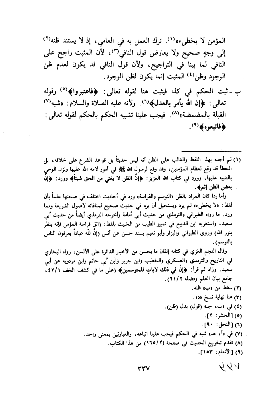 المؤمن لا يخطئ" (١). ترك العمل به في العامي، إذ لا يستند ظنه (٢) إلى وجهٍ صحيح ولا يعارض قول النافي (٣)، لأن المثبت راجح على النافي لما بينا في التراجيح، ولأن قول النافي قد يكون لعدم ظن الوجود وظن (٤) المثبت إنما يكون لظن الوجود.