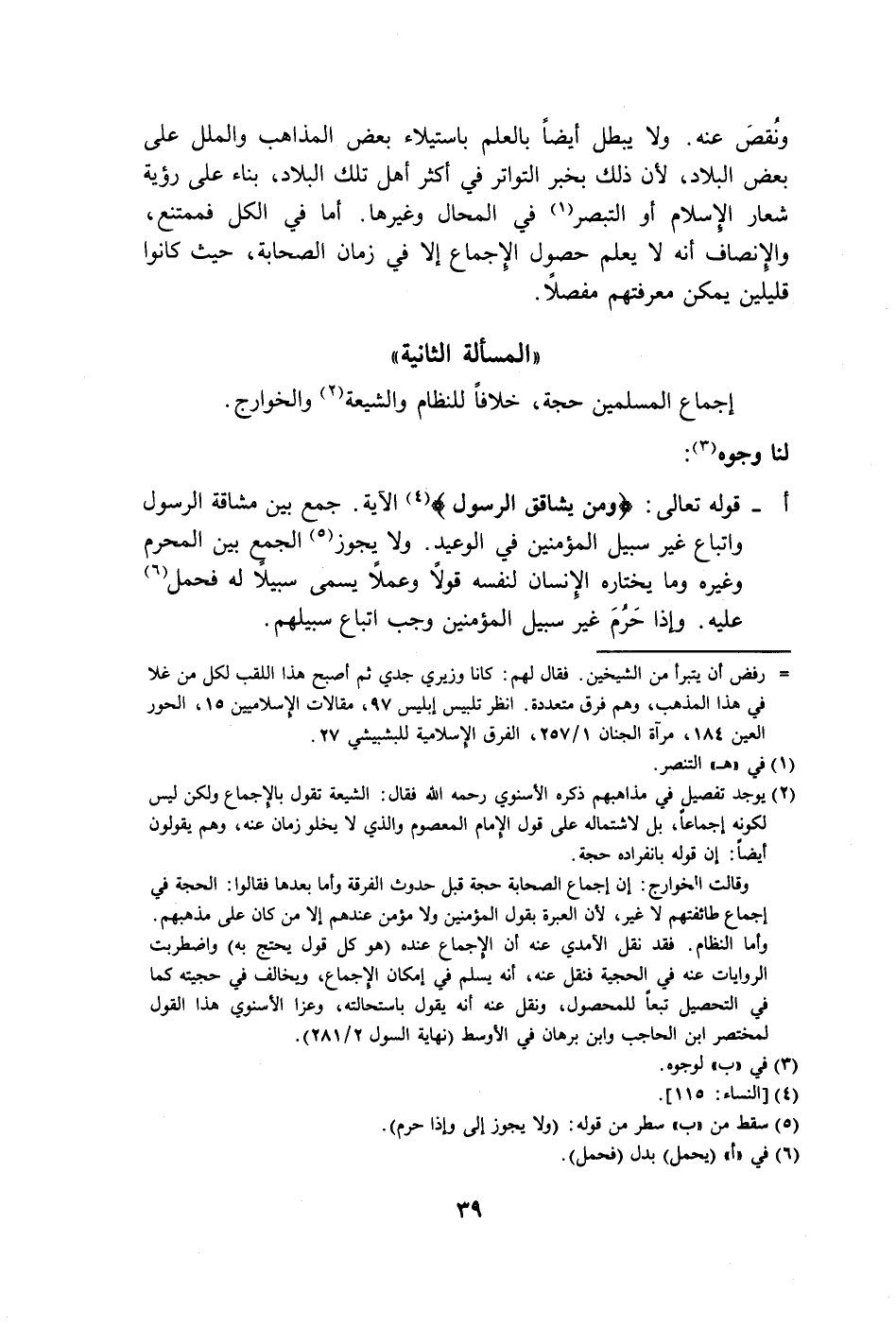 إجماع المسلمين حجة، خلافاً للنظام والشيعة (٢) والخوارج.