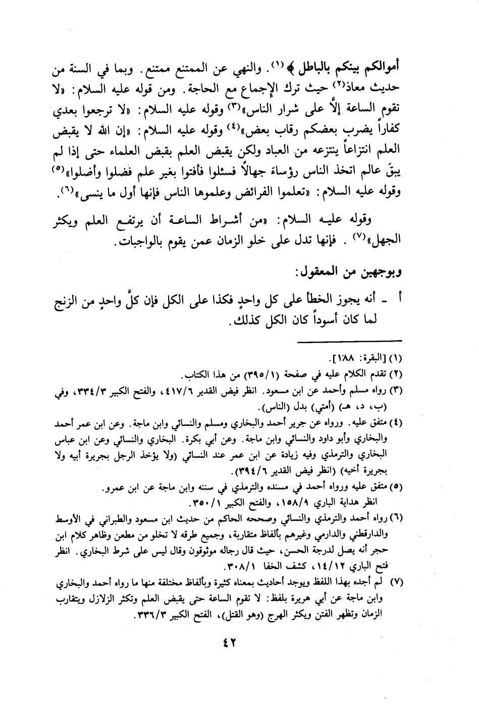 أَمْوَالَكُمْ بَيْنَكُمْ بِالْبَاطِلِ} (١). والنهي عن الممتنع ممتنع. وبما في السنة من حديث معاذ (٢) حيث ترك الإجماع مع الحاجة. ومن قوله عليه السلام: "لا تقوم الساعة إلا على شرار الناس" (٣) وقوله عليه السلام: "لا ترجعوا بعدي كفاراً يضرب بعضكم رقاب بعض" (٤) وقوله عليه السلام: "إن الله لا يقبض العلم انتزاعاً ينتزعه من العباد ولكن يقبض العلم بقبض العلماء حتى إذا لم يبقَ عالم اتخذ الناس رؤساءَ جهالاً فسئلوا فأفتوا بغير علم فضلوا وأضلوا" (٥)