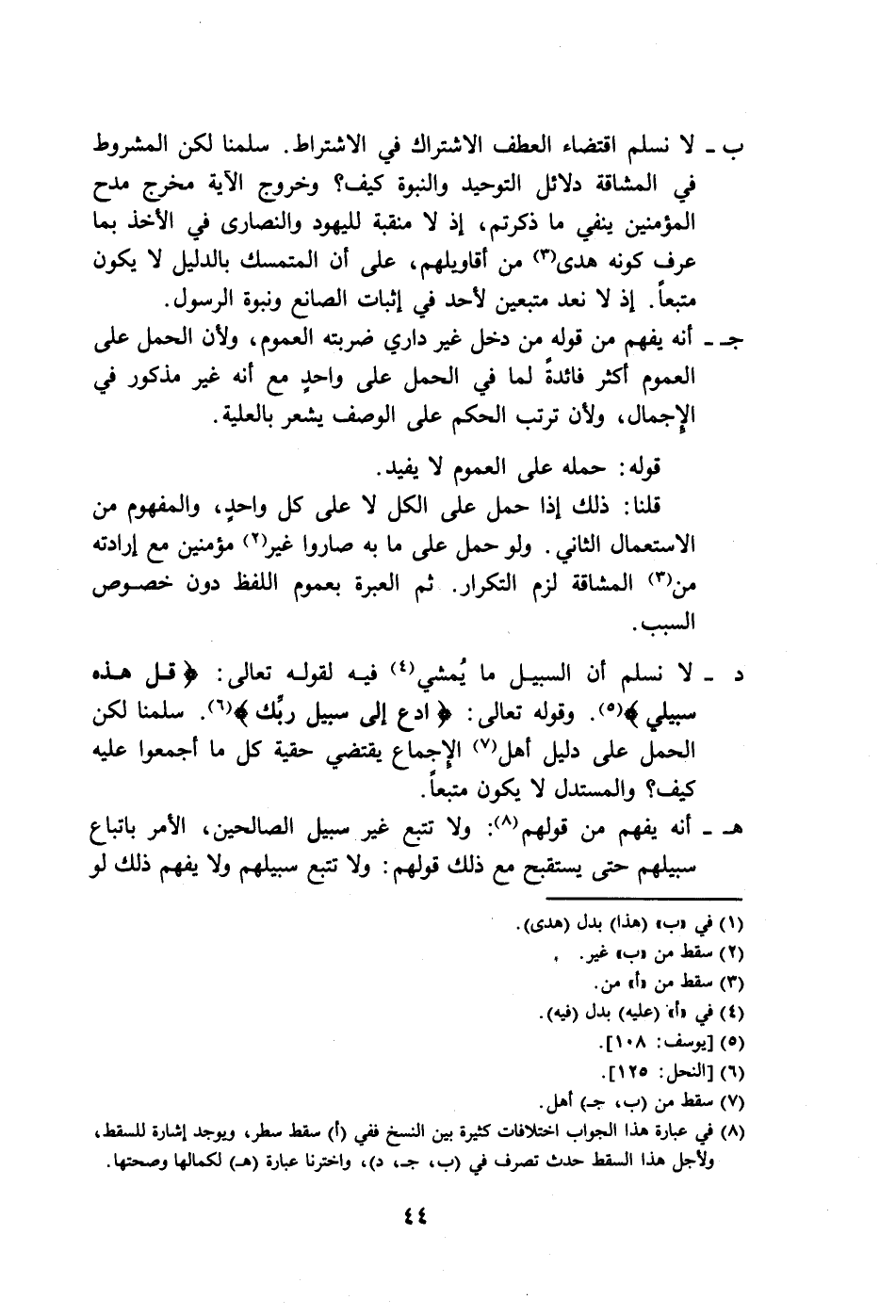 د- لا نسلم أن السبيل ما يُمشي (٤) فيه لقوله تعالى: {قُلْ هَذِهِ سَبِيلِي} (٥). وقوله تعالى: {ادْعُ إِلَى سَبِيلِ رَبِّكَ} (٦). سلمنا لكن الحمل على دليل أهل (٧) الإجماع يقتضي حقية كل ما أجمعوا عليه كيف؟ والمستدل لا يكون متبعاً.