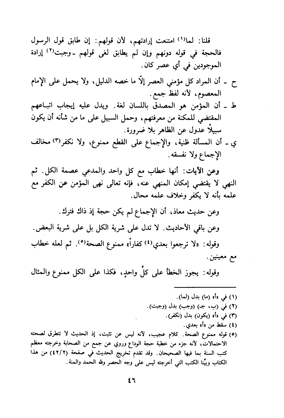 وقوله: "لا ترجعوا بعدي (٤) كفاراً" ممنوع الصحة (٥). ثم لعله خطاب مع معينين.