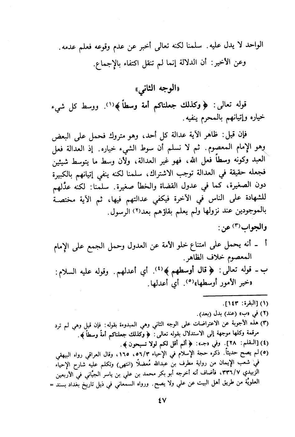 فإن قيل: ظاهر الآية عدالة كل أحد، وهو متروك. فحمل على البعض وهو الإمام المعصوم. ثم لا نسلم أن سوط الشيء خياره. إذ العدالة فعل العبد وكونه وسطاً فعل الله، فهو غير العدالة، ولأن وسط ما يتوسط شيئين فجعله حقيقة في العدالة توجب الاشتراك، سلمنا لكنه ينفي إتيانهم بالكبيرة دون الصغيرة، كما في عدول القضاة والخطأ صغيرة. سلمنا: لكنه عذلهم للشهادة على الناس في الآخرة فيكفي عدالتهم فيها، ثم الآية مختصة بالموجودين عند نزولها ولم يعلم بقاؤهم بعد (٢) الرسول.