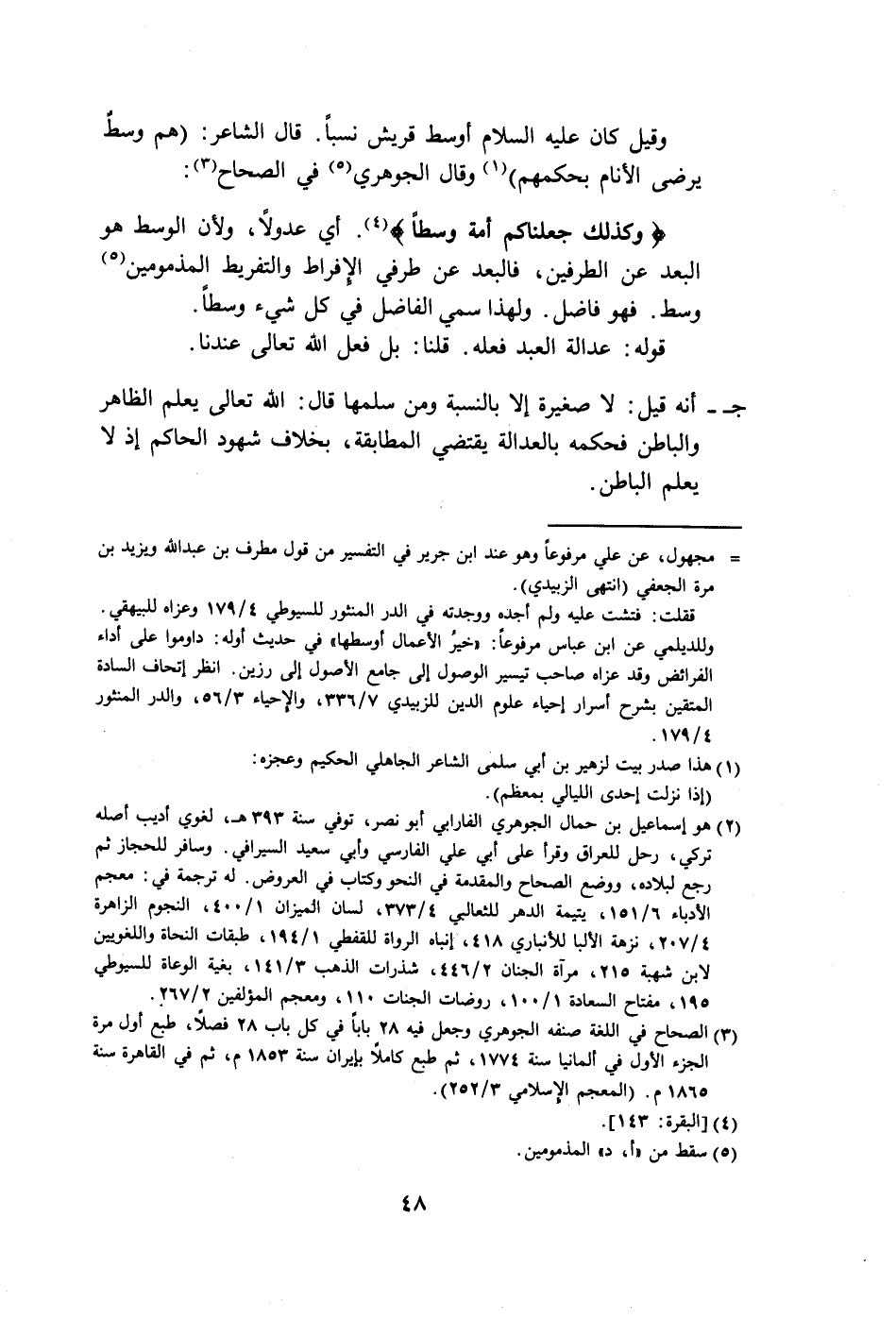 وقيل كان عليه السلام أوسط قريش نسباً. قال الشاعر: (هم وسطٌ يرضى الأنام بحكمهم) (١) وقال الجوهري (٢) في الصحاح (٣): {وَكَذَلِكَ جَعَلْنَاكُمْ أُمَّةً وَسَطًا} (٤). أي عدولًا، ولأن الوسط هو البعد عن الطرفين، فالبعد عن طرفي الإفراط والتفريط المذمومين (٥) وسط. فهو فاضل. ولهذا سمي الفاضل في كل شيء وسطاً.
