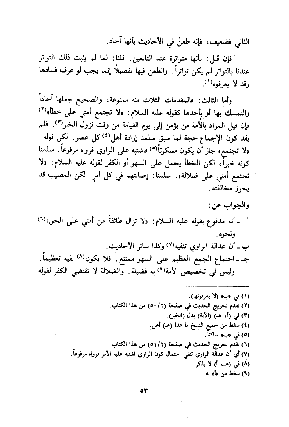 وأما الثالث: فالمقدمات الثلاث منه ممنوعة، والصحيح جعلها آحاداً والتمسك بها أو بأحدها كقوله عليه السلام: "لا تجتمع أمتي على خطأ" (٢) فإن قيل المراد بالأمة من يؤمن إلى يوم القيامة من وقت نزول الخبر (٣). فلم يفد كون الإجماع حجة لما سبق سلمنا إرادة أهل (٤) كل عصر. لكن قوله: "لا تجتمع" جاز أن يكون مسكوتاً (٥) فأشتبه على الراوي فرواه مرفوعاً. سلمنا كونه خبراً، لكن الخطأ يحمل على السهو أو الكفر لقوله عليه السلام: "لا تجتمع أمتي على ضلالة". سلمنا: إصابتهم في كل أمرٍ. لكن المصيب قد يجوز مخالفته.