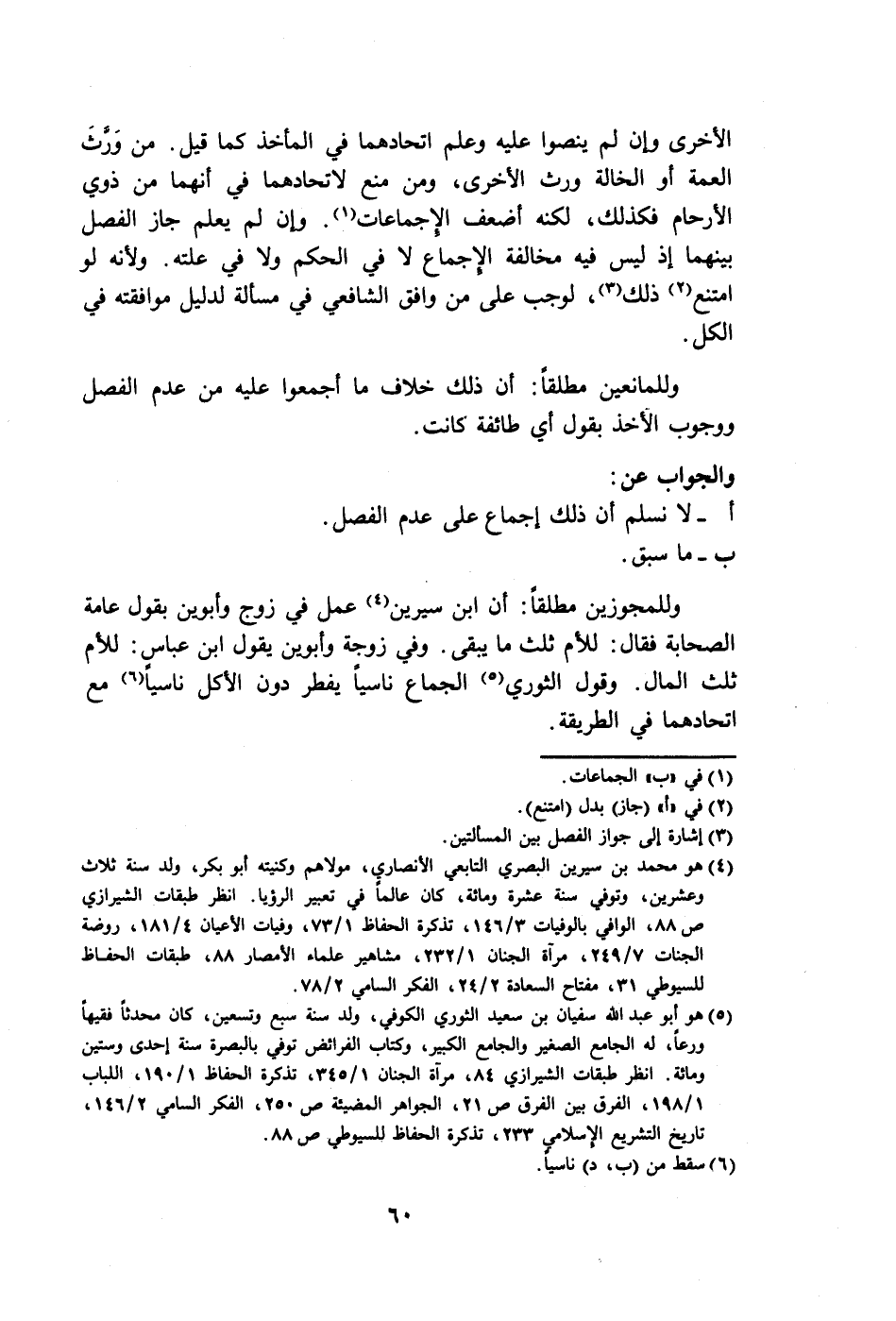 (٥) هو أبو عبد الله سفيان بن سعيد الثوري الكوفيِّ، ولد سنة سبع وتسعين، كان محدثًا فقيهاً ورعًا، له الجامع الصَّغير والجامع الكبير، وكتاب الفرائض توفي بالبصرة سنة إحدى وستين ومائة. انظر طبقات الشيرازي ٨٤، مراة الجنان ١/ ٣٤٥، تذكرة الحفَّاظ ١/ ١٩٠، اللباب ١/ ١٩٨، الفرق بين الفرق ص ٢١، الجواهر المضيئة ص ٢٥٠، الفكر السامي ٢/ ١٤٦، تاريخ التّشريع الإسلامي ٢٣٣، تذكرة الحفاظ اللسيوطي ص ٨٨.