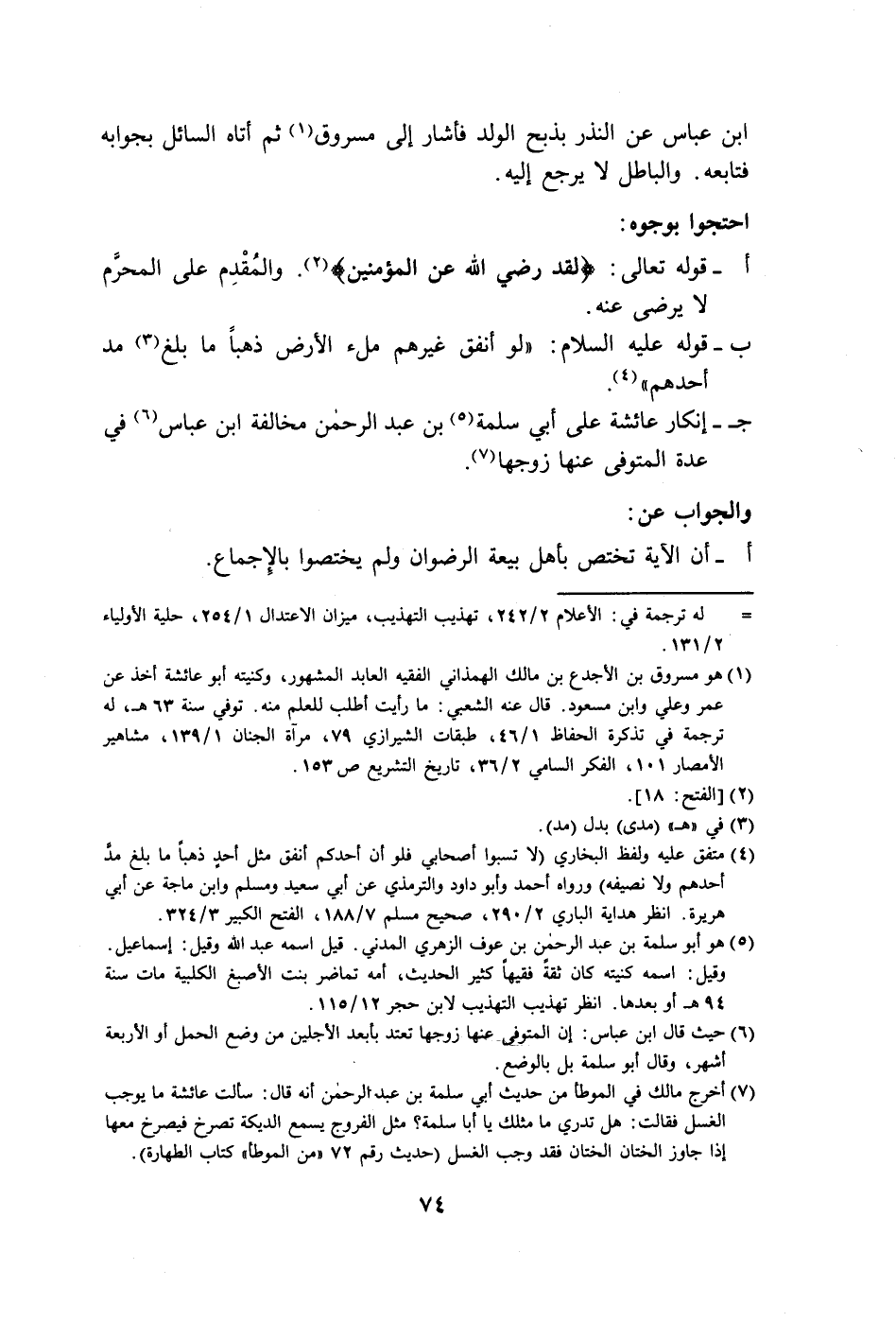 (٦) حيث قال ابن عباس: إن المتوفى عنها زوجها تعتد بأبعد الأجلين من وضع الحمل أو الأربعة أشهر، وقال أبو سلمة بل بالوضع.