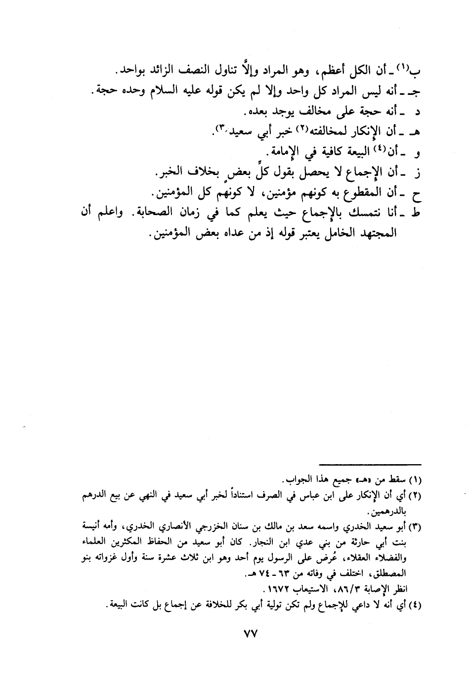ط - أنا نتمسك بالإجماع حيث يعلم كما في زمان الصّحابة. وأعلم أن المجتهد الخامل يعتبر قوله إذ من عداه بعض المؤمنين.