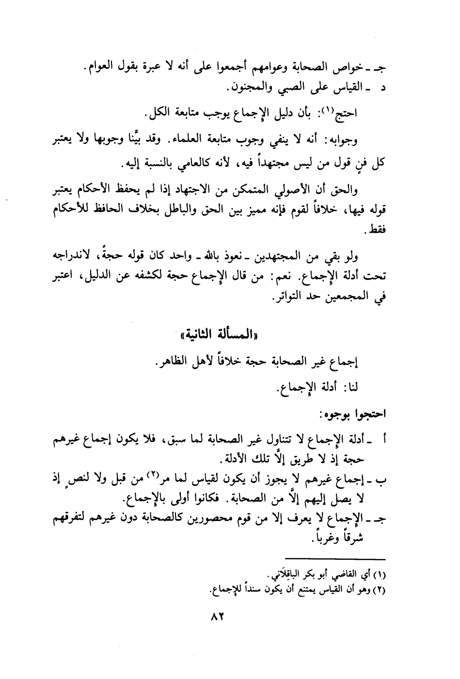 جـ - الإجماع لا يعرف إلَّا من قوم محصورين كالصحابة دون غيرهم لتفرقهم شرقاً وغرباً.