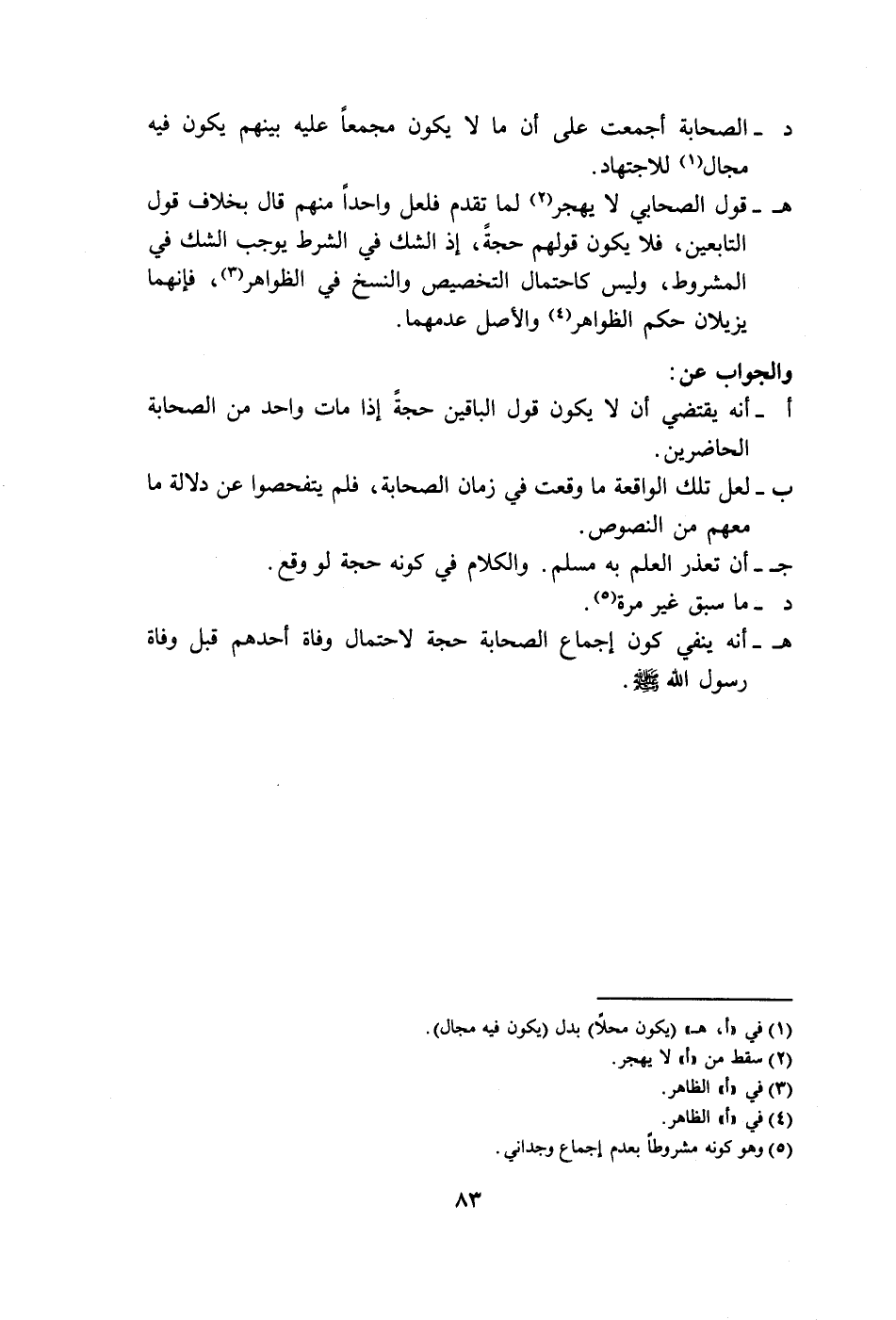 د- الصّحابة أجمعت على أن ما لا يكون مجمعًا عليه بينهم يكون فيه مجال (١) للاجتهاد.