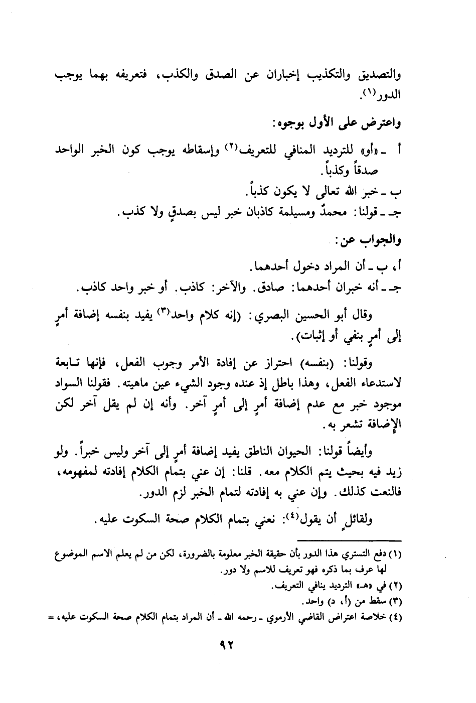 أ - "أو" للترديد المنافى للتعريف (٢) وإسقاطه يوجب كون الخبر الواحد صدقاً وكذباً.