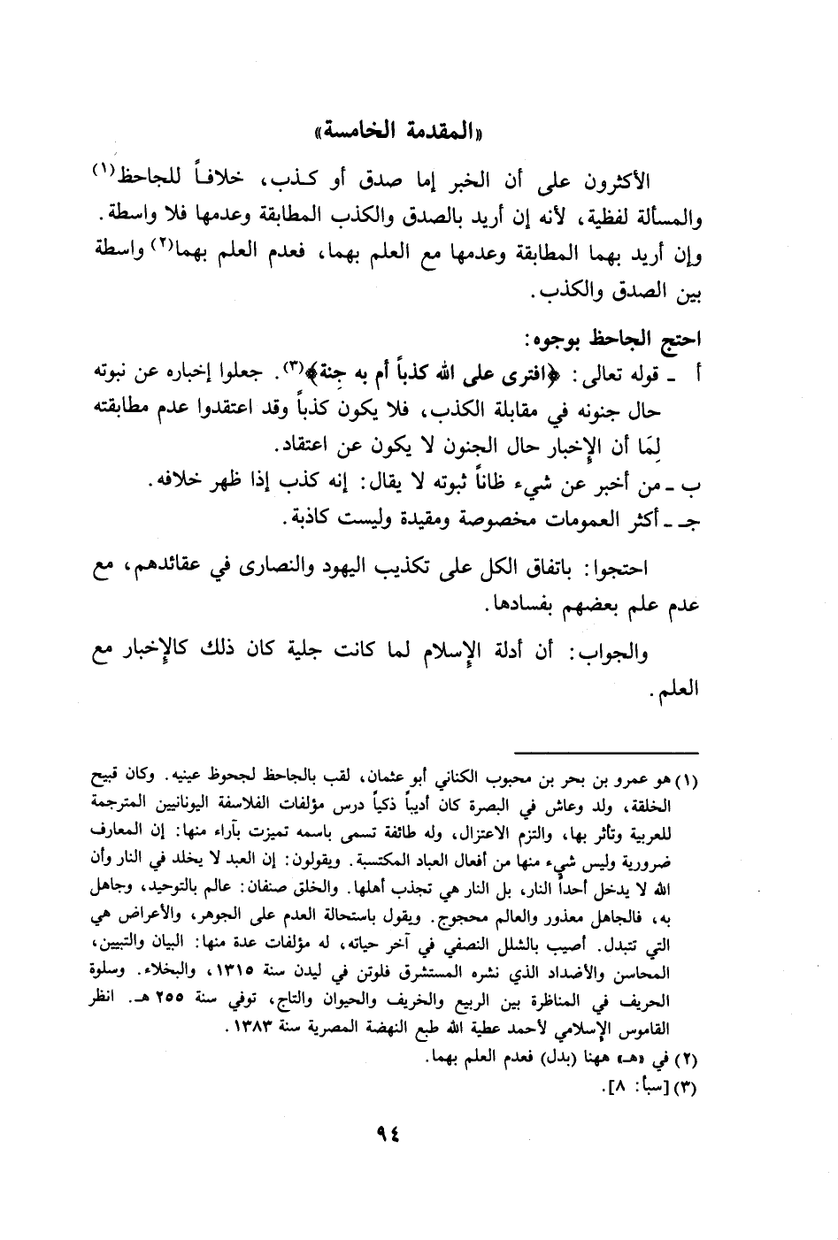 (١) هو عمرو بن بحر بن محبوب السيناني أبو عثمان، لقب بالجاحظ لجحوظ عينيه. وكان قبيح الخلقة، ولد وعاش في البصرة كان أديباً ذكياً درس مؤلفات الفلاسفة اليونانيين المترجمة للعربية وتأثر بها، والتزم الاعتزال، وله طائفة تسمى باسمه تميزت بآراء منها: إن المعارف ضرورية وليس شيء منها من أفعال العباد المكتسبة. ويقولون: إن العبد لا يخلد في النَّار وأن