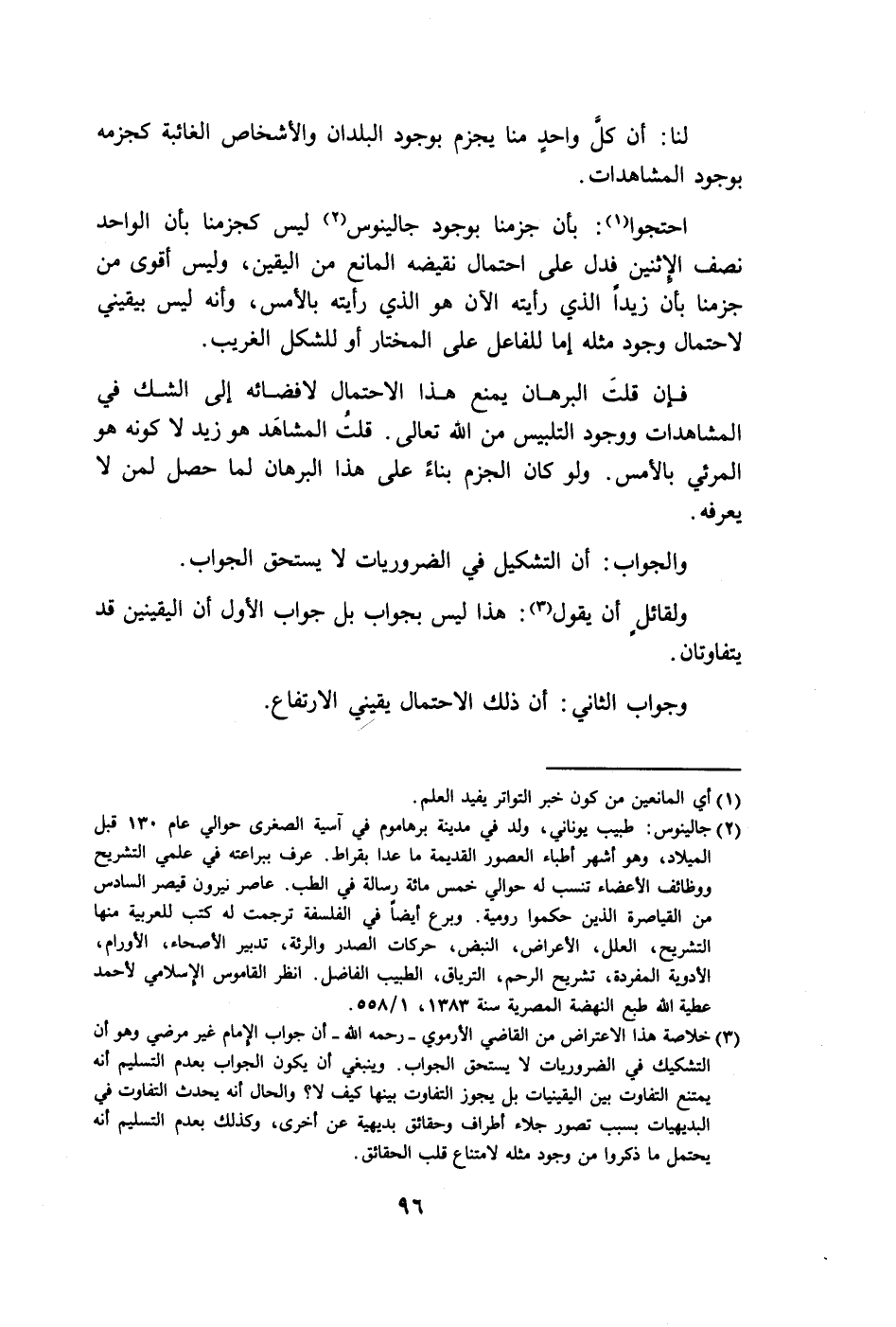 فإن قلتَ البرهان يمنع هذا الاحتمال لافضائه إلى الشَّك في المشاهدات ووجود التلبيس من الله تعالى. قلتُ المشاهَد هو زيد لا كونه هو المرئي بالأمس. ولو كان الجزم بناءً على هذا البرهان لما حصل لمن لا يعرفه.