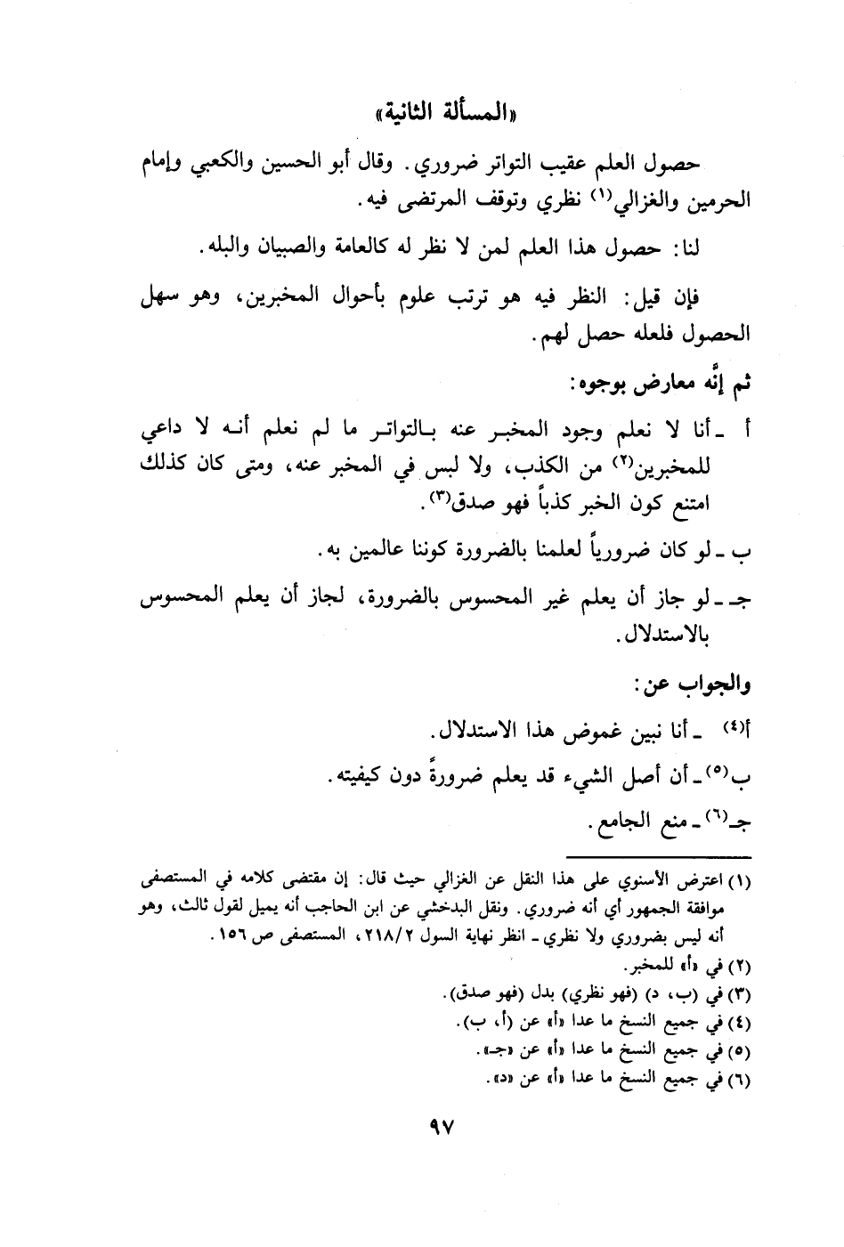 (١) اعترض الأسنوي على هذا النقل عن الغزالي حيث قال: إن مقتض كلامه في المستصفى موافقة الجمهور أي أنَّه ضروري. ونقل البدخشي عن ابن الحاجب أنَّه يميل لقول ثالث، وهو أنَّه ليس بضروري ولا نظري- انظر نهاية السول ٢/ ٢١٨، المستصفى ص ١٥٦.