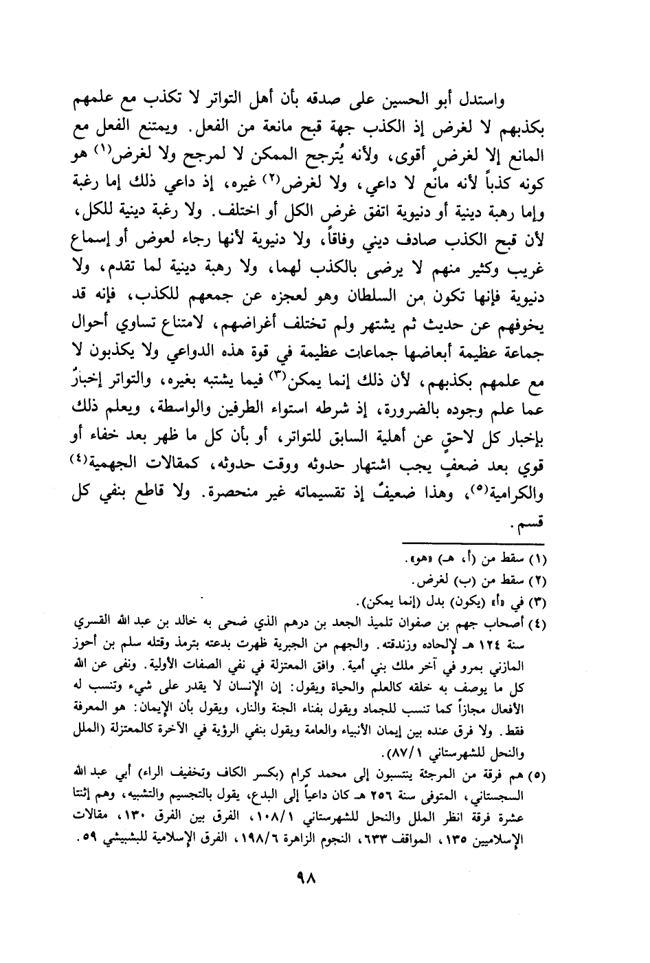 واستدل أبو الحسين على صدقه بأن أهل التواتر لا تكذب مع علمهم بكذبهم لا لغرض إذ الكذب جهة قبح مانعة من الفعل. ويمتنع الفعل مع المانع إلَّا لغرض أقوى، ولأنه يُترجح الممكن لا لمرجح ولا لغرض (١) هو كونه كذباً لأنَّه مانع لا داعي، ولا لغرض (٢) غيره، إذ داعي ذلك إما رغبة وإما رهبة دينية أو دنيوية اتفق غرض الكل أو اختلف. ولا رغبة دينية للكل، لأنَّ قبح الكذب صادف ديني وفاقاً، ولا دنيوية لأنها رجاء لعوض أو إسماع غريب وكثير منهم لا يرضى بالكذب لهما، ولا رهبة دينية لما تقدم، ولا دنيوية فإنَّها تكون من السلطان وهو لعجزه عن جمعهم للكذب، فإنَّه قد يخوفهم عن حديث ثم يشتهر ولم تختلف أغراضهم، لامتناع تساوي أحوال جماعة عظيمة أبعاضها جماعات عظيمة في قوة هذه الدواعي ولا يكذبون لا مع علمهم بكذبهم، لأنَّ ذلك إنَّما يمكن (٣) فيما يشتبه بغيره، والتواتر إخبارٌ عما علم وجوده بالضرورة، إذ شرطه استواء الطرفين والواسطة، ويعلم ذلك بإخبار كل لاحق من أهلية السابق للتواتر، أو بأن كل ما ظهر بعد خفاء أو قوي بعد ضعفٍ يجب اشتهار حدوثه ووقت حدوثه، كمقالات الجهمية (٤) والكرامية (٥)، وهذا ضعيفٌ إذ تقسيماته غير منحصرة. ولا قاطع بنفي كل