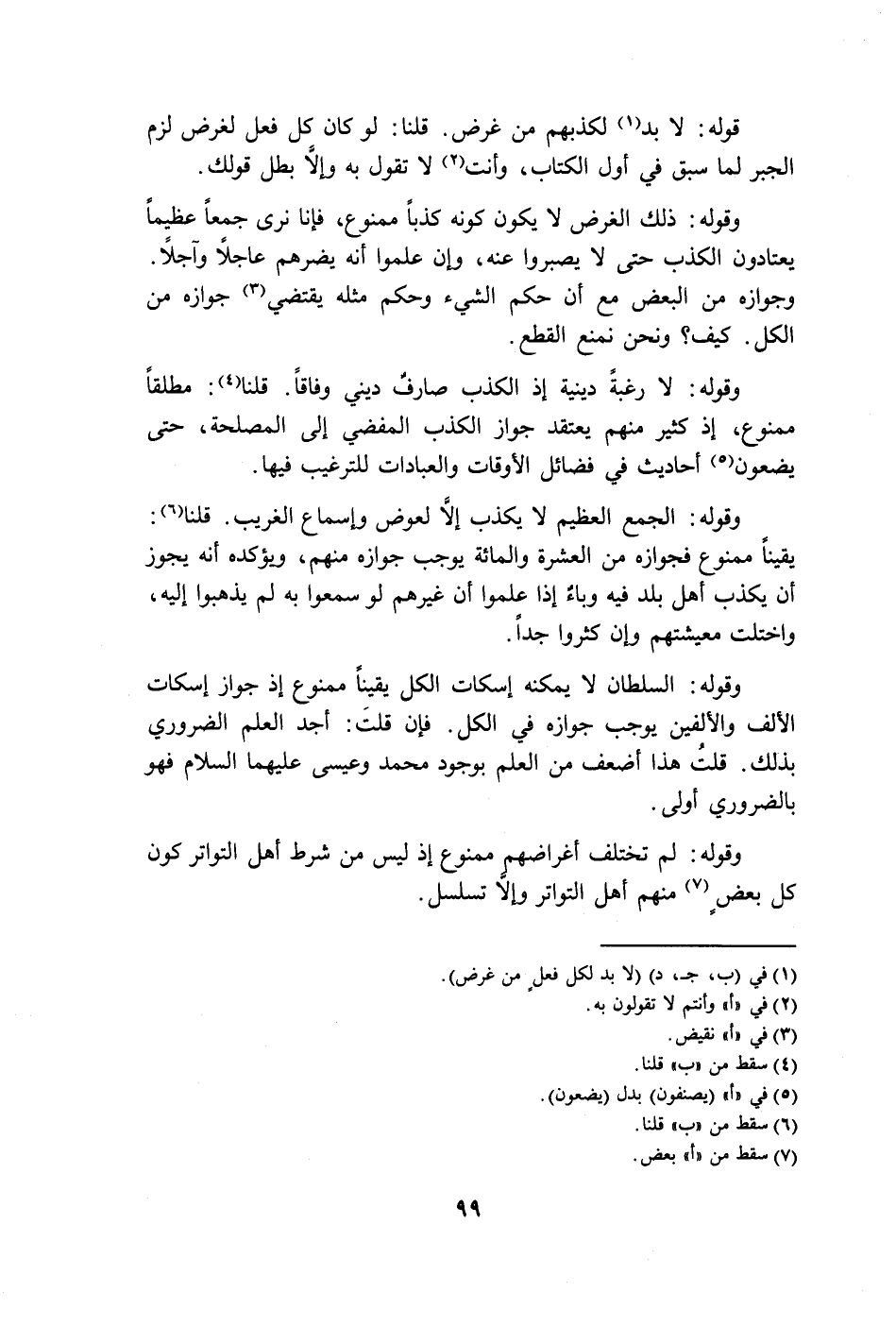 وقوله: الجمع العظيم لا يكذب إلَّا لعوض وإسماع الغريب. قلنا (٦): يقينًا ممنوع فجوازه من العشرة والمائة يوجب جوازه منهم، ويؤكده أنَّه يجوز أن يكذب أهل بلد فيه وباب إذا علموا أن غيرهم لو سمعوا به لم يذهبوا إليه، واختلت معيشتهم وإن كثروا جداً.