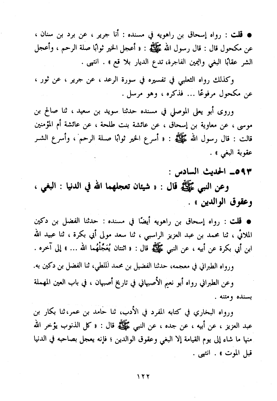قلت رَوَاهُ إِسْحَاق بن رَاهَوَيْه أَيْضا فِي مُسْنده حَدثنَا الْفضل بن دُكَيْن الْملَائي حَدثنَا مُحَمَّد بن عبد الْعَزِيز الرَّاسِبِي حَدثنَا سعد مولَى أبي بكرَة حَدثنَا عبيد الله ابْن أبي بكرَة عَن أَبِيه عَن النَّبِي صَلَّى اللَّهُ عَلَيْهِ وَسَلَّم َ قَالَ (اثْنَتَانِ يعجلهما الله) إِلَى آخِره