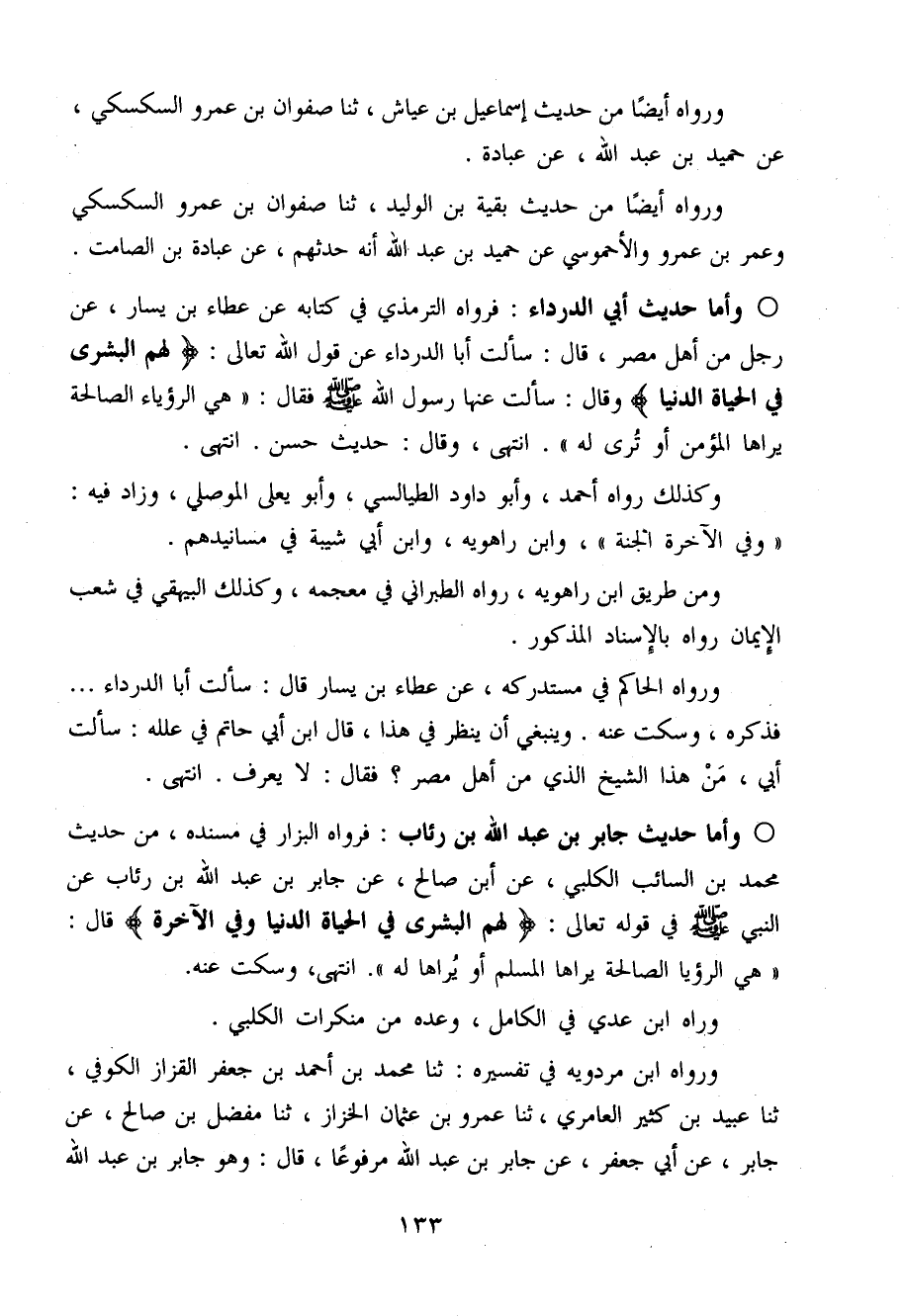 وَأما حَدِيث أبي الدَّرْدَاء فَرَوَاهُ التِّرْمِذِيّ فِي كِتَابه عَن عَطاء بن يسَار عَن رجل من أهل مصر قَالَ سَأَلت أَبَا الدَّرْدَاء عَن قَوْله تَعَالَى لَهُم الْبُشْرَى فِي الْحَيَاة الدُّنْيَا وَقَالَ سَأَلت عَنْهَا رَسُول الله صَلَّى اللَّهُ عَلَيْهِ وَسَلَّم َ فَقَالَ (هِيَ الرُّؤْيَا الصَّالِحَة يَرَاهَا الْمُؤمن أَو ترَى لَهُ) انْتَهَى وَقَالَ حَدِيث حسن انْتَهَى
