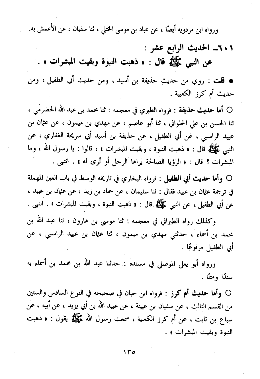 وَأما حَدِيث أبي الطُّفَيْل فَرَوَاهُ البُخَارِيّ فِي تَارِيخه الْوسط فِي بَاب الْعين الْمُهْملَة فِي تَرْجَمَة عُثْمَان بن عبيد فَقَالَ حَدثنَا سُلَيْمَان عَن حَمَّاد بن زيد عَن عُثْمَان بن عبيد عَن أبي الطُّفَيْل عَن النَّبِي صَلَّى اللَّهُ عَلَيْهِ وَسَلَّم َ قَالَ (ذهبت النُّبُوَّة وَبقيت الْمُبَشِّرَات) انْتَهَى