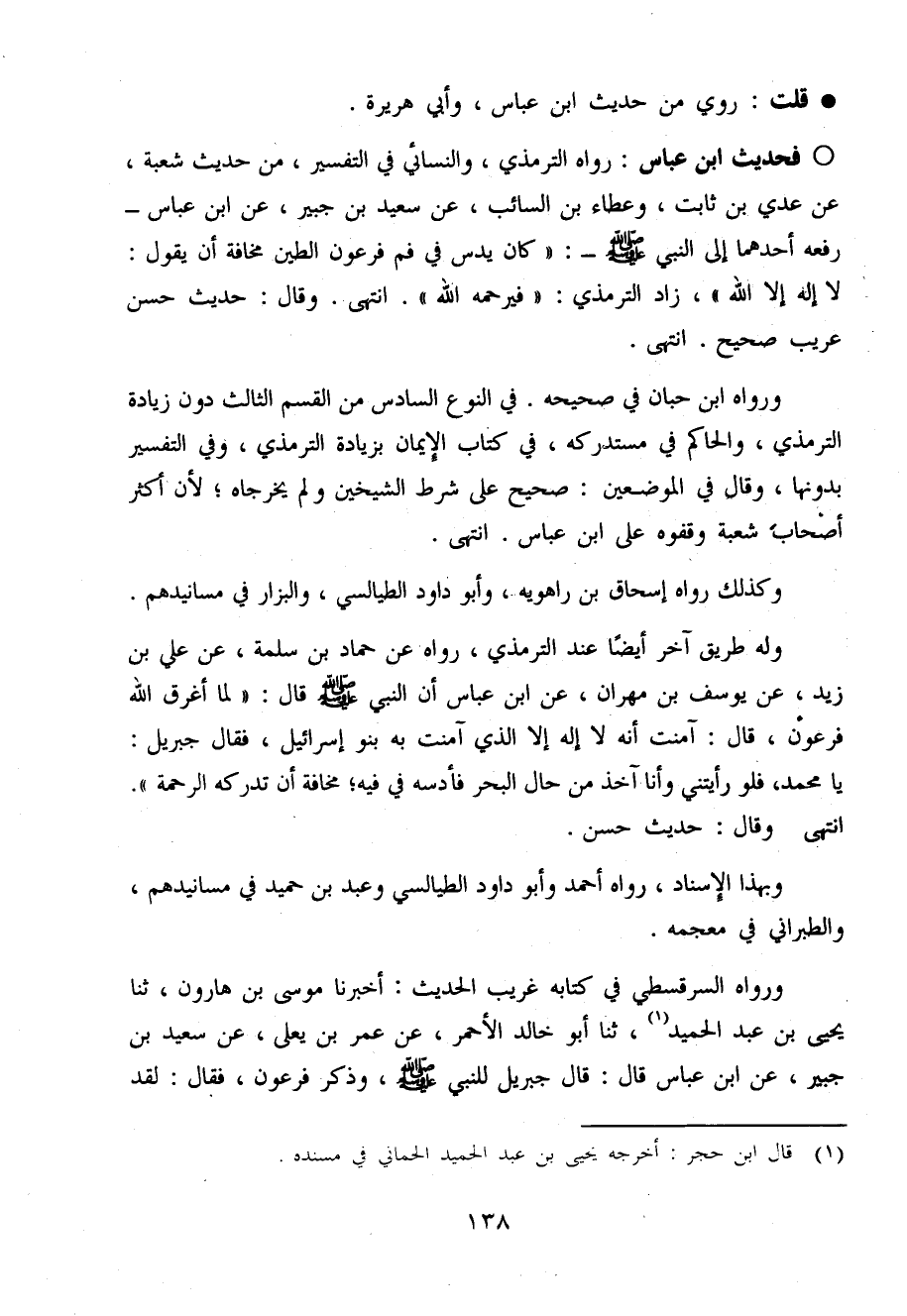 فَحَدِيث ابْن عَبَّاس رَوَاهُ التِّرْمِذِيّ وَالنَّسَائِيّ فِي التَّفْسِير من حَدِيث شُعْبَة عَن عدي بن ثَابت وَعَطَاء بن السَّائِب عَن سعيد بن جُبَير عَن ابْن عَبَّاس رَفعه أَحدهمَا إِلَى النَّبِي صَلَّى اللَّهُ عَلَيْهِ وَسَلَّم َ كَانَ يدس فِي فَم فِرْعَوْن الطين مَخَافَة أَن يَقُول لَا إِلَه إِلَّا الله زَاد التِّرْمِذِيّ فيرَحِمَهُ اللَّهُ
