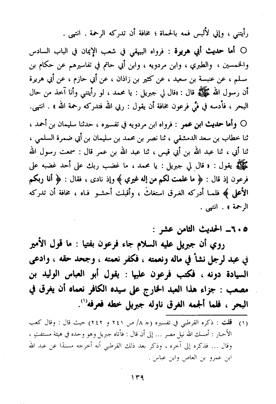 أما حَدِيث أبي هُرَيْرَة فَرَوَاهُ الْبَيْهَقِيّ فِي شعب الْإِيمَان فِي الْبَاب السَّادِس وَالْخمسين والطبري وَابْن مرْدَوَيْه وَابْن أبي حَاتِم فِي تفاسيرهم عَن حكام بن سلم عَن عَنْبَسَة بن سعيد عَن كثير بن زَاذَان عَن أبي حَازِم عَن أبي هُرَيْرَة أَن رَسُول الله صَلَّى اللَّهُ عَلَيْهِ وَسَلَّم َ قَالَ (قَالَ لي جِبْرِيل يَا مُحَمَّد لَو رَأَيْتنِي وَأَنا آخذ من حَال الْبَحْر فَأَدُسهُ فِي فِي فِرْعَوْن مَخَافَة أَن يَقُول رَبِّي الله فَتُدْرِكهُ رَحْمَة الله)